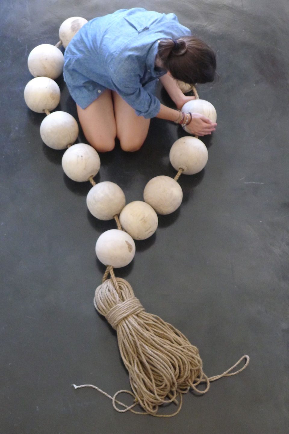 The small prayer bead sculptures made of African beads are the studies that informed this piece. The large sculpture amplifies the message and offers us the opportunity of interaction. They are stripped of decoration, reduced to its essence. They are the rosary, the mala, the worry bead – Our common talisman. May we be reminded of our truth. Buddhists say the beads are our illusory experiences of life and the thread is our essence our Truth. The beads are made from a found Tipuana {Rosewood} tree, felled in January 2014 and turned in February. It remains ‘green’ to encourage the cracks, symbolic of humanity and an invitation for light to enter. Size large 180 – 200mm / 7 – 7.87 inches x 14 beads. Thread and tassel are twine.